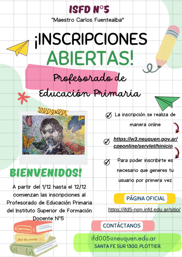 Desde diciembre están abiertas las inscripciones para ingresantes al Profesorado de Educación Primaria del Instituto Superior de Formación Docente N°5 (ISFD N°5) «Maestro Carlos Fuentealba».